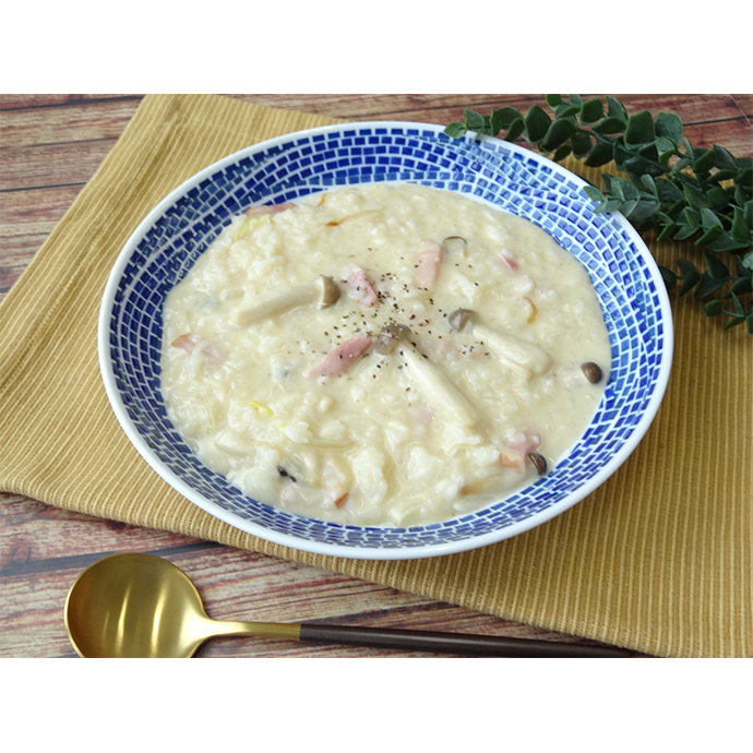 ご飯、水、コンソメ、牛乳、ロルフ チーズフォンデュ 160gを加え、煮る。