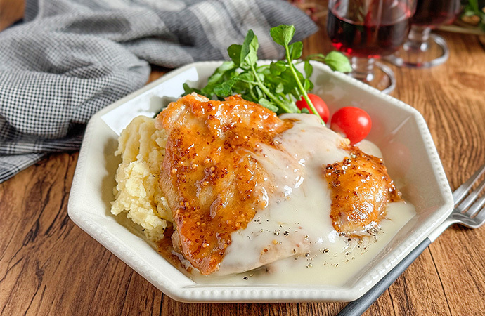 香ばしく焼いた鶏もも肉に、粒マスタードとはちみつを合わせたハニーマスタードソースを絡め、さらにロルフ チーズフォンデュをとろ~りとかけて仕上げます。チーズフォンデュの濃厚なコクと、はちみつの甘み、マスタードの酸味が絶妙に調和し、思わずご飯が進む一品に。