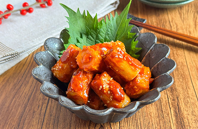 ピリッと辛いロルフ ポケッチ(唐辛子にんにく)をちくわに詰め、甘辛いヤンニョムソースで絡めた一品です。