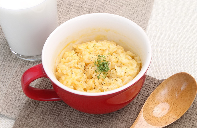 加熱後、軽く混ぜ、ロルフ ポケッチ(明太子味)、牛乳を入れて、再度電子レンジ500Wで2分加熱する。