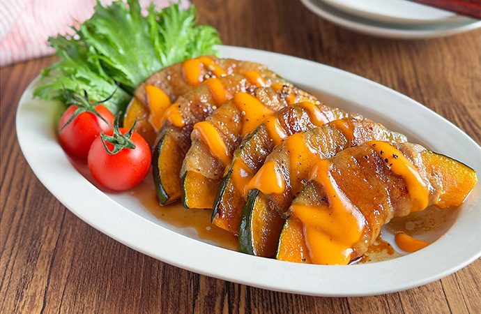 かぼちゃを豚バラで巻いて甘辛だれを絡めた、ごはんがすすむ主菜です。仕上げに「ロルフ そのまま使えるチーズソース(チェダーチーズ味)」をたっぷりかければ、濃厚でコク深い味わいに仕上がります。とろ~りなめらかな口どけがたまらない一品です。