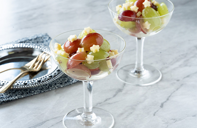ジューシーで甘酸っぱいぶどうと「ロルフ 星ふりチーズ」をマリネにしました。見た目もかわいらしく、簡単に作れる一品です。フルーツは、いちごやパイナップル、オレンジなど、お好みのものに替えてもお楽しみいただけます。