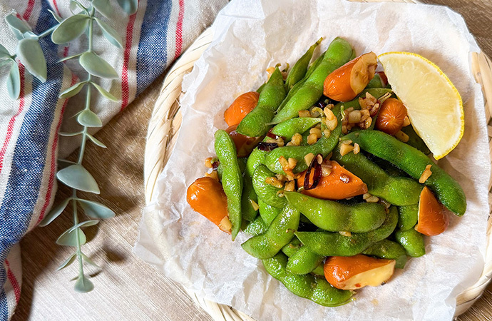 にんにくと唐辛子のパンチが効いた枝豆とスモークチーズを組み合わせた、お酒が進むこと間違いなしのやみつきおつまみです!