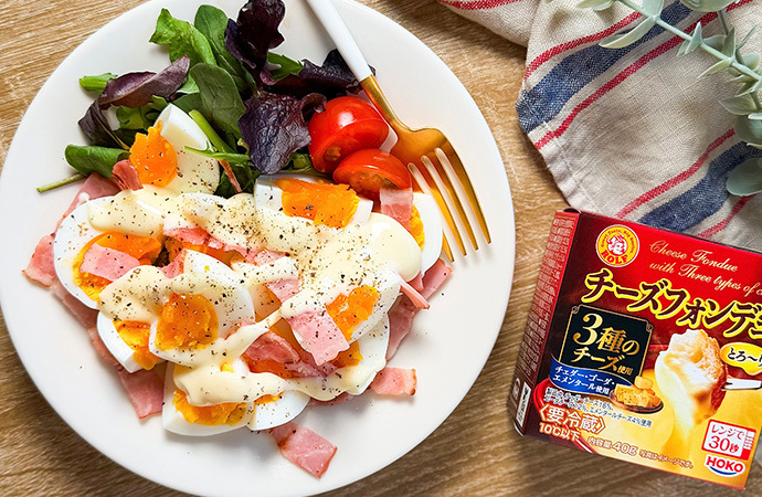 食パンはトースターでこんがりするまで焼き、1と電子レンジで表示時間通り加熱したロルフ チーズフォンデュ 40gをのせる。もう一枚の食パンでサンドし、半分に切る。
