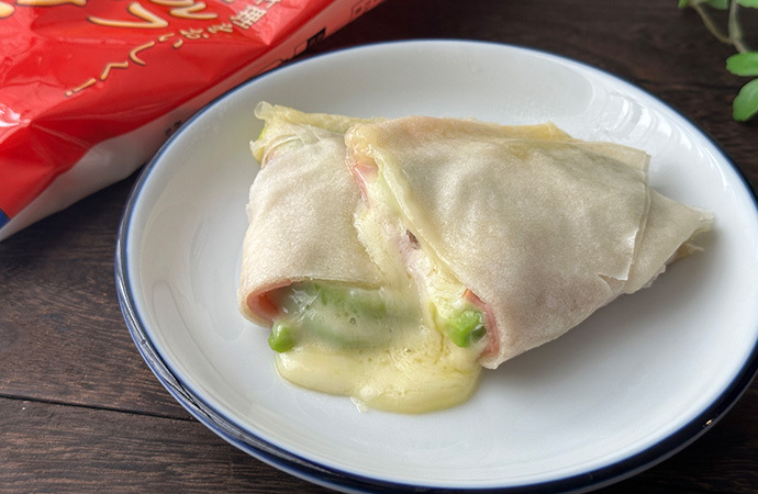 春巻きの皮は2枚重ねて水(分量外)に濡らし、角が手前に来るように広げる。スライスハム、7mm幅にスライスしたアボカド、料理をおいしく! ロルフ とろけるチーズをのせて巻く。